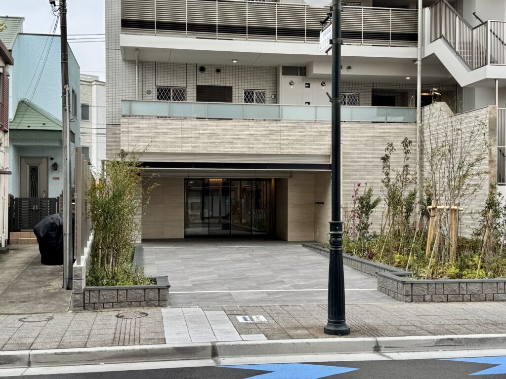 敷地は2面接道しており、エントランスは敷地北側。建物はセットバックされ、エントランスまで奥行きのあるアプローチからは、住まいの格を感じます 。子供がエントランスを飛び出しても大丈夫そう。