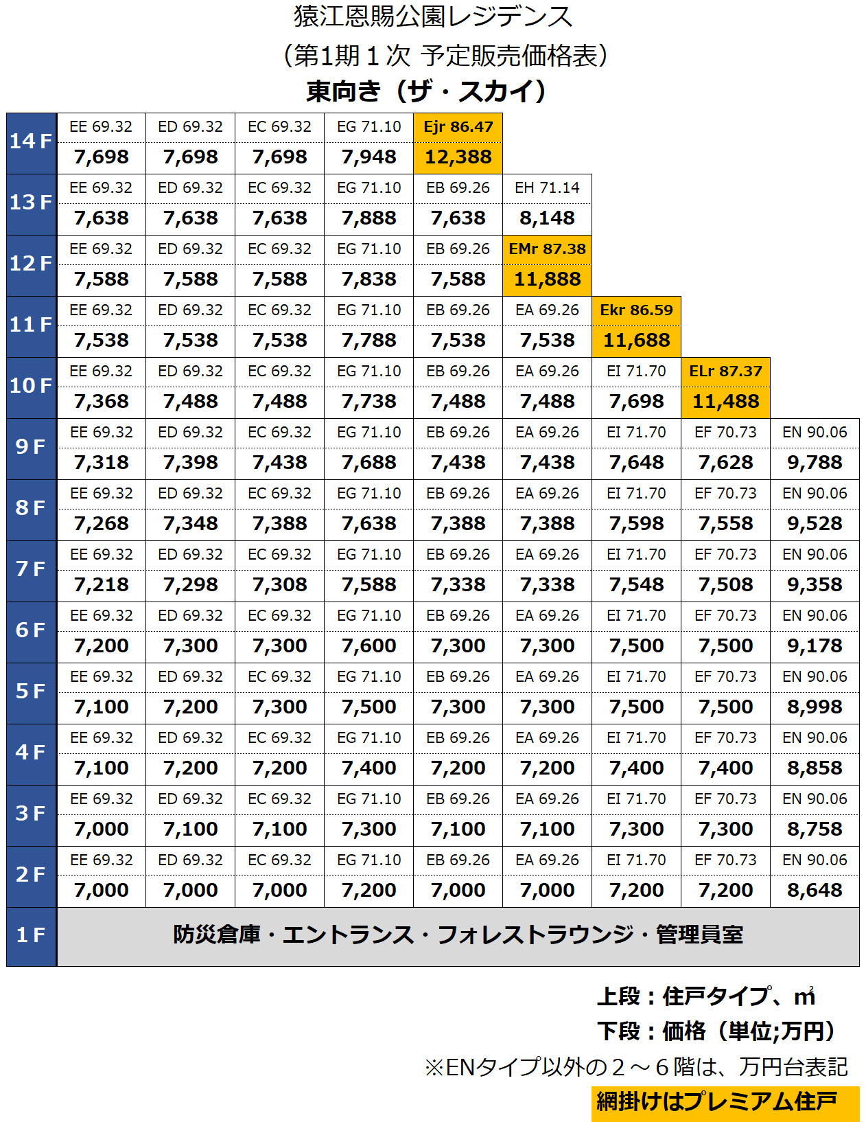 第1期1次の予定販売価格表です(ENタイプ以外の2階~6階は○○○○万円台の意)。