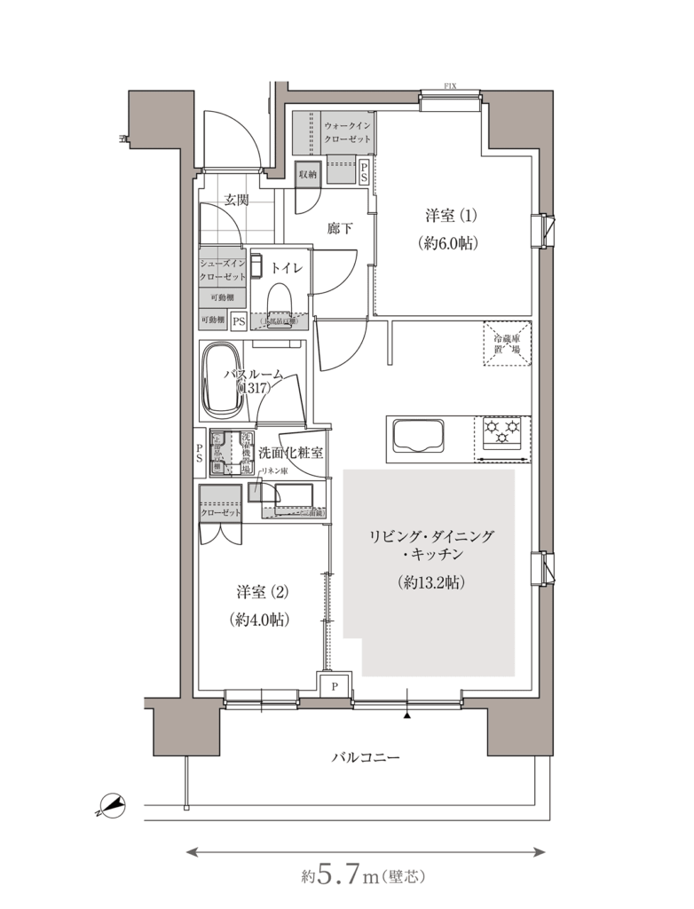 しっかりした形で居住性が高い形の2LDK。廊下をクランクインして入る設計で、玄関からLDを見られず住戸に奥行き感があります。6畳の居室がリビングアウトで、内廊下設計にもかかわらず2面採光が取れています。4畳の洋室は開けておけばLDが広い空間になり解放的な生活を楽しめます。一番選びたい間取りだと思いました。