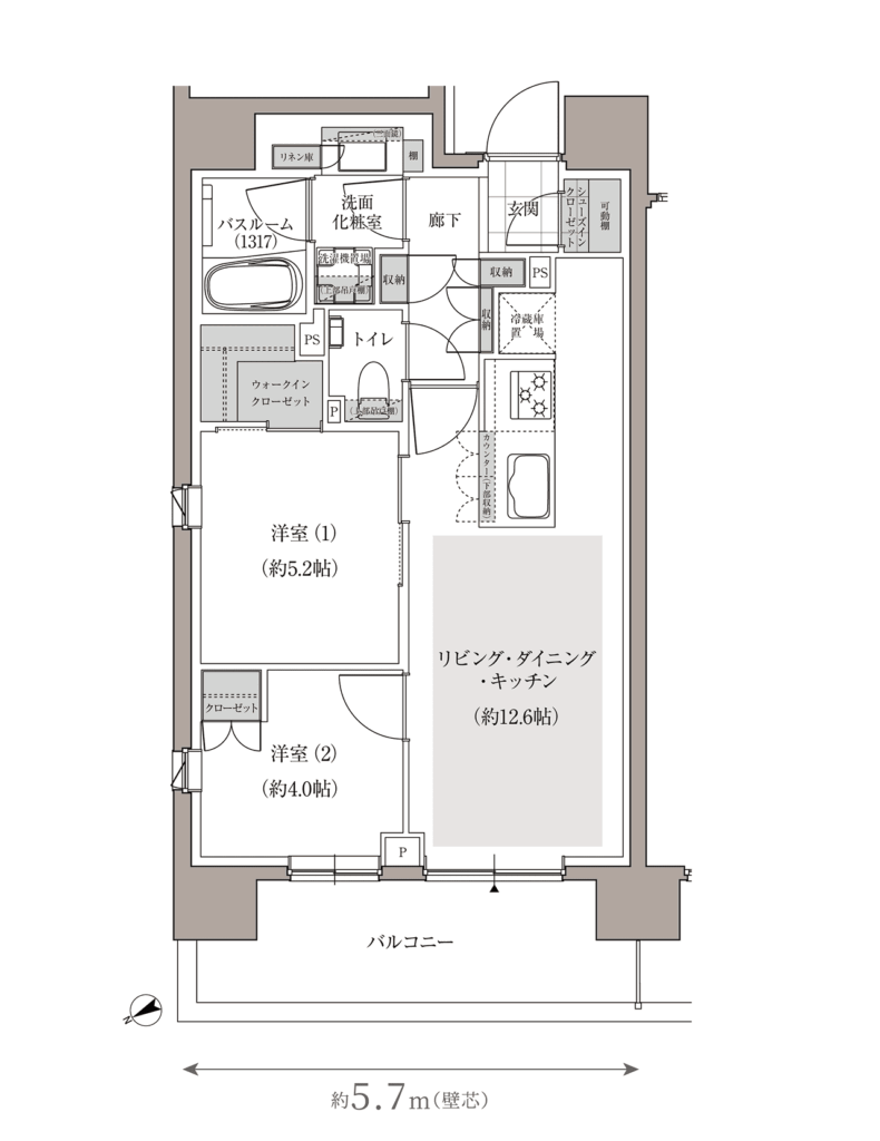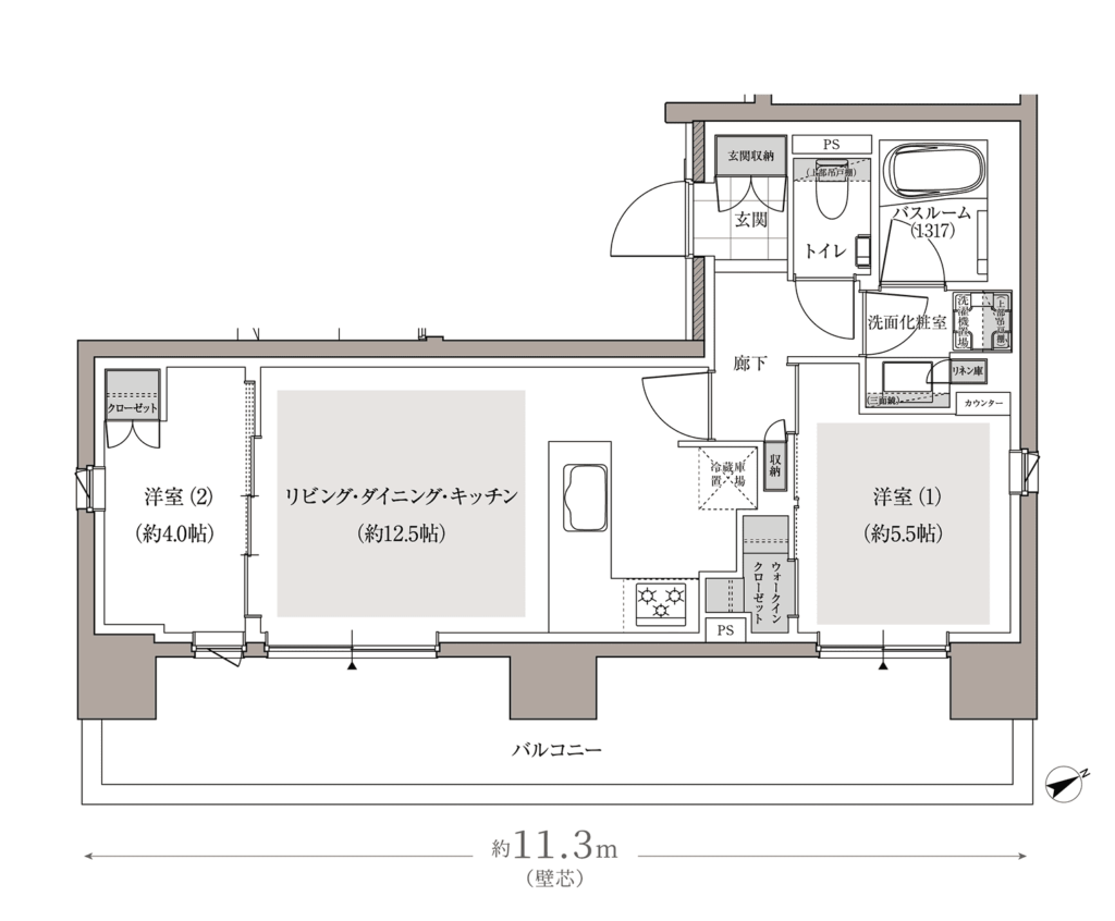 ワイドスパン住戸で3面採光のプラン。洋室1と洗面室がリビングアウトで、洋室2を解放してLDを広くできますし、廊下の形状も「住まい」らしくて暮らしやすそう。広々としたL字キッチンで料理も楽しくなりそうです。