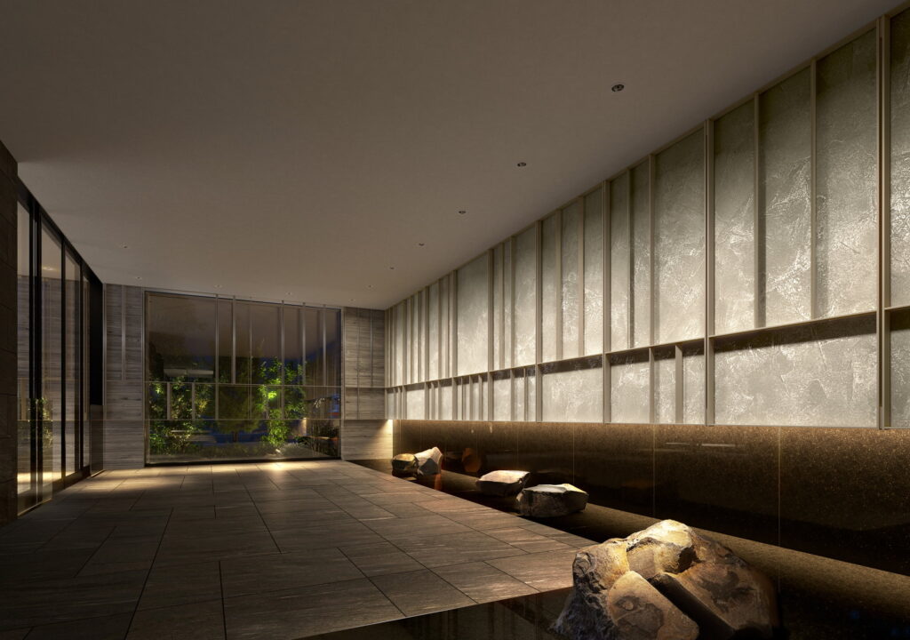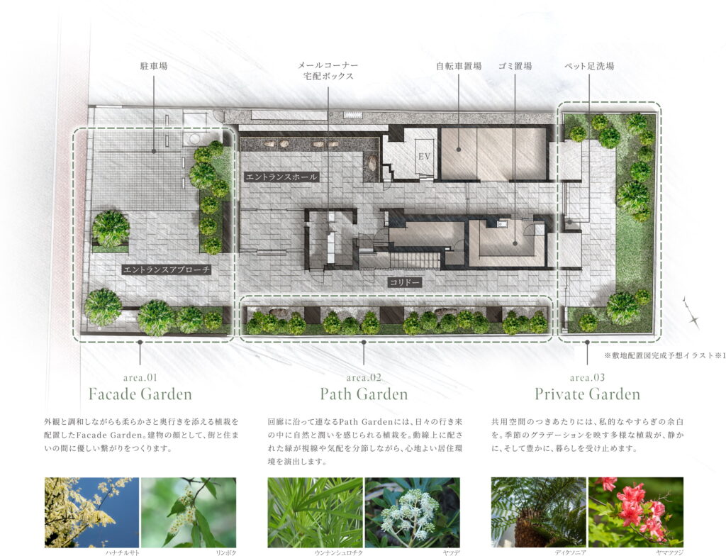 道路、歩道から奥行きあるアプローチをつくり、エントランスまでのひとときを感じる邸宅観を醸成。敷地周りにぐるっと豊かな植栽が取り巻き、ゴミ置き場、駐輪場、ペット足洗い場に向かう建物脇の生活動線は、路地風のデザイン回廊を設けて戸建ての庭のような上質空間。