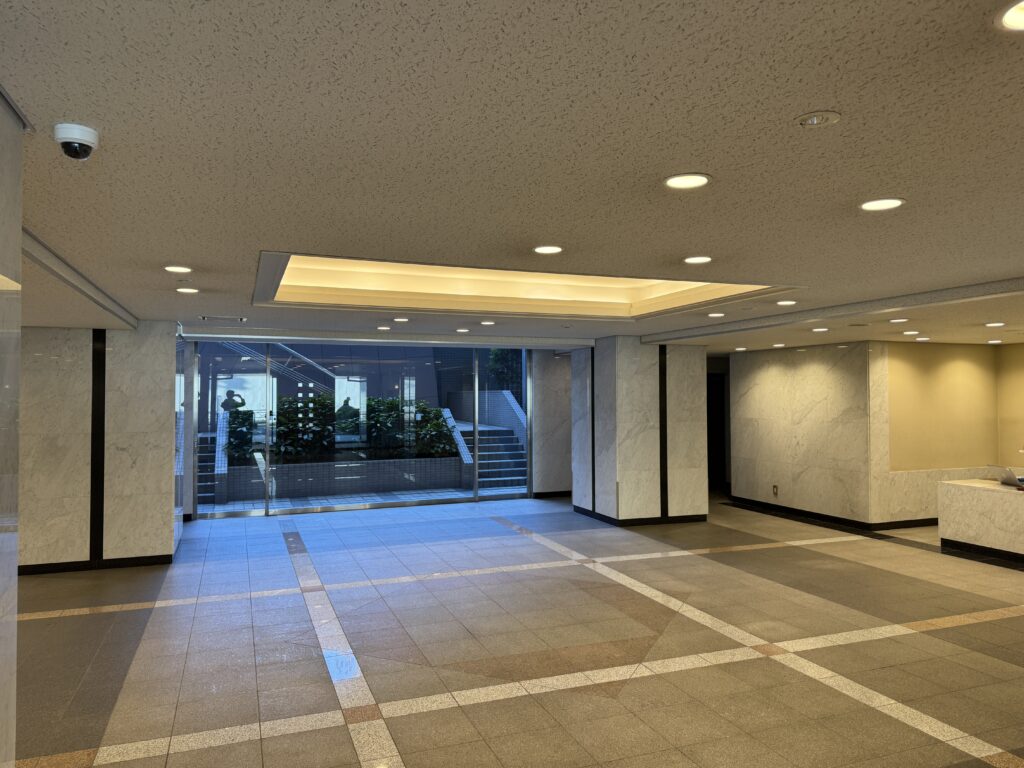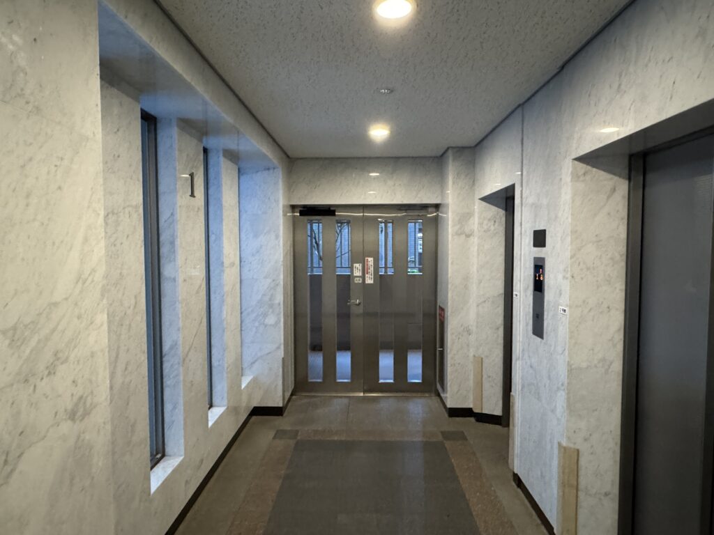 共用部も綺麗に維持されています。エントランスを入るとラウンジがあり、ここで来訪者応対ができます。御影石を使った壁やEVホールも豪華。