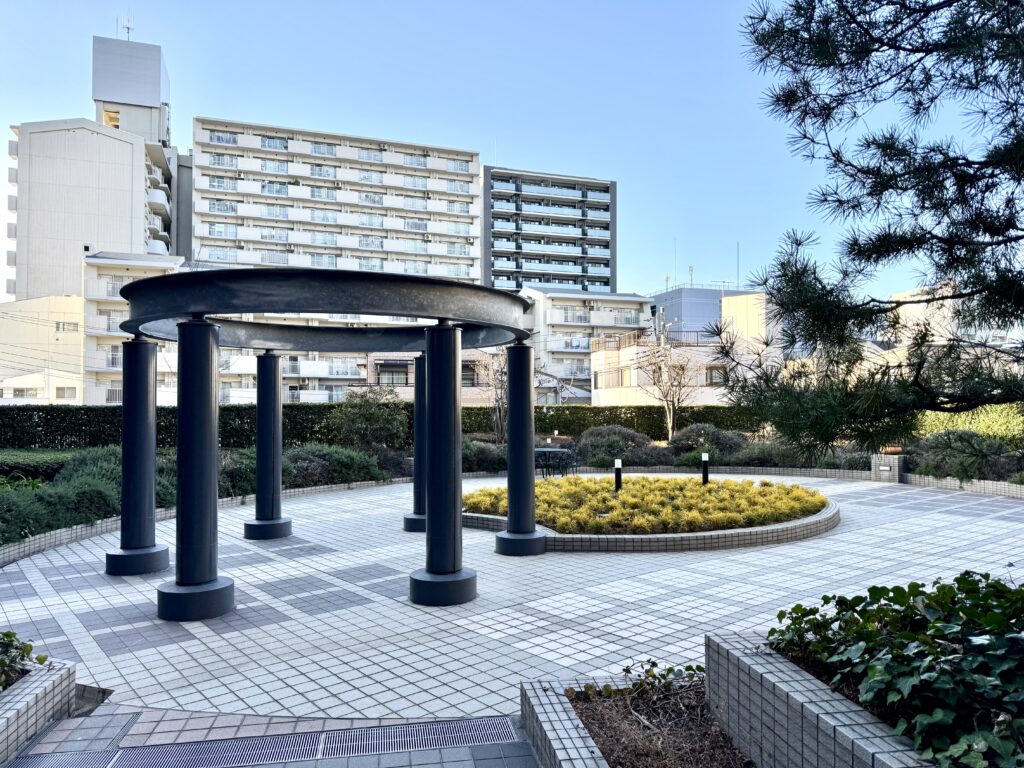 このマンションのデメリットというか、人によって合わないところは、この恵まれた立地ゆえの喧騒でしょうか。うるさいわけではないのですが、駅の出口が隣にあるので、マンションの前を通り過ぎる観光客など通行人がそれなりに多いです。その影響か、本来であれば、植栽やオブジェを形どったエントランス前の公開空地も、人が入れないように柵が設けられてしまっているのが少し残念だなと思いました。