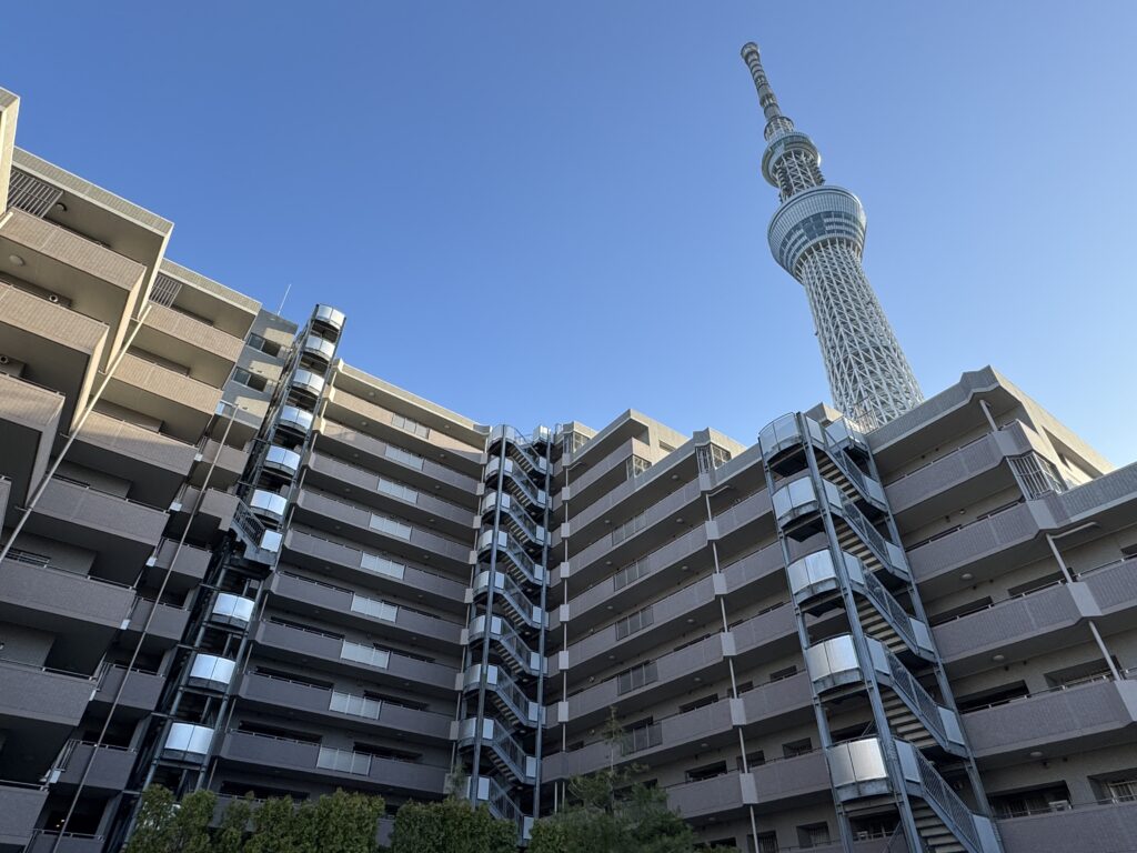 マンションは、「東京スカイツリー」駅、東武伊勢崎線の高架の北側にあり、開けた環境に建つため存在感があります。逆梁アウトフレームの重厚な建物は、まだ古さを感じません。