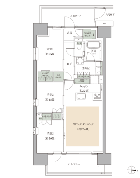 両脇の角住戸は70㎡以上あって、ゆとりがあります。LDも広く、お好みの家具を置いて、ゆとりある生活をおくれるでしょう。全居室に窓、家具を置きやすい形の空間。洗面室が広めでリビングアウトも良いですね。