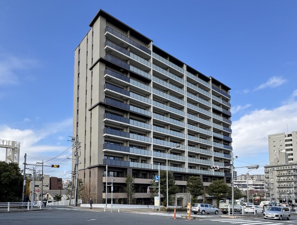 敷地は幅員が広い道路沿い。周囲が開けて明るく、マンションのランドスケープ全体が、ひと際目立つ場所。