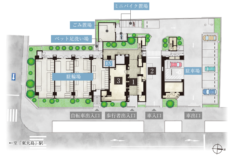 最寄り駅は都営新宿線「東大島」駅(徒歩8分)。駅周辺から交差点を渡って広い歩道を北に向かって歩き出すと、佇まいが視界正面に入ってきます。まもなく我が家に着くことが感じられる「ほっとする」帰り道。歩道が広くフラットな歩きやすい動線です。