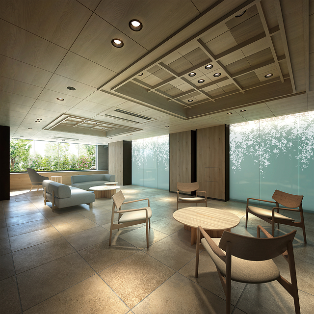 共用部は多くありませんが、1階に広々としたラウンジがあります。木目の天井と壁、そして藤棚のガラスアートや亀戸らしい亀甲紋をモチーフにしたアートオブジェをあしらえた素敵な空間になっています。サードプレイスとしてくつろいだり、来訪者応対もできます。