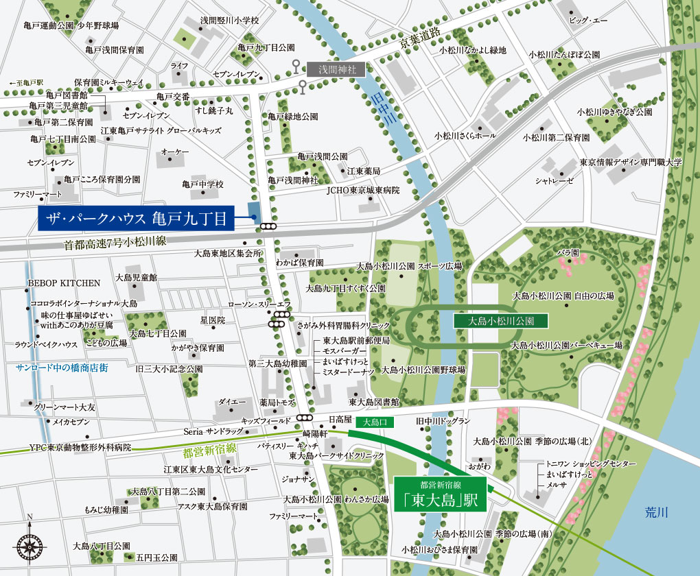 錦糸町や亀戸駅のように、賑やかで利便性が高い商業地域ではありませんが、周りには複数のスーパーが点在、東大島駅周辺の商業施設や大島の商店街「サンロード中の橋」(徒歩8分)も近いので生活環境は良好です。「繁華街に近い喧噪は苦手だけど利便性は確保したいし、少しでも穏やかに暮らしたい」と考えている家族に向いた場所。