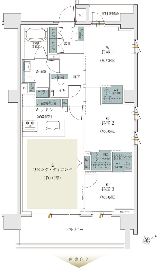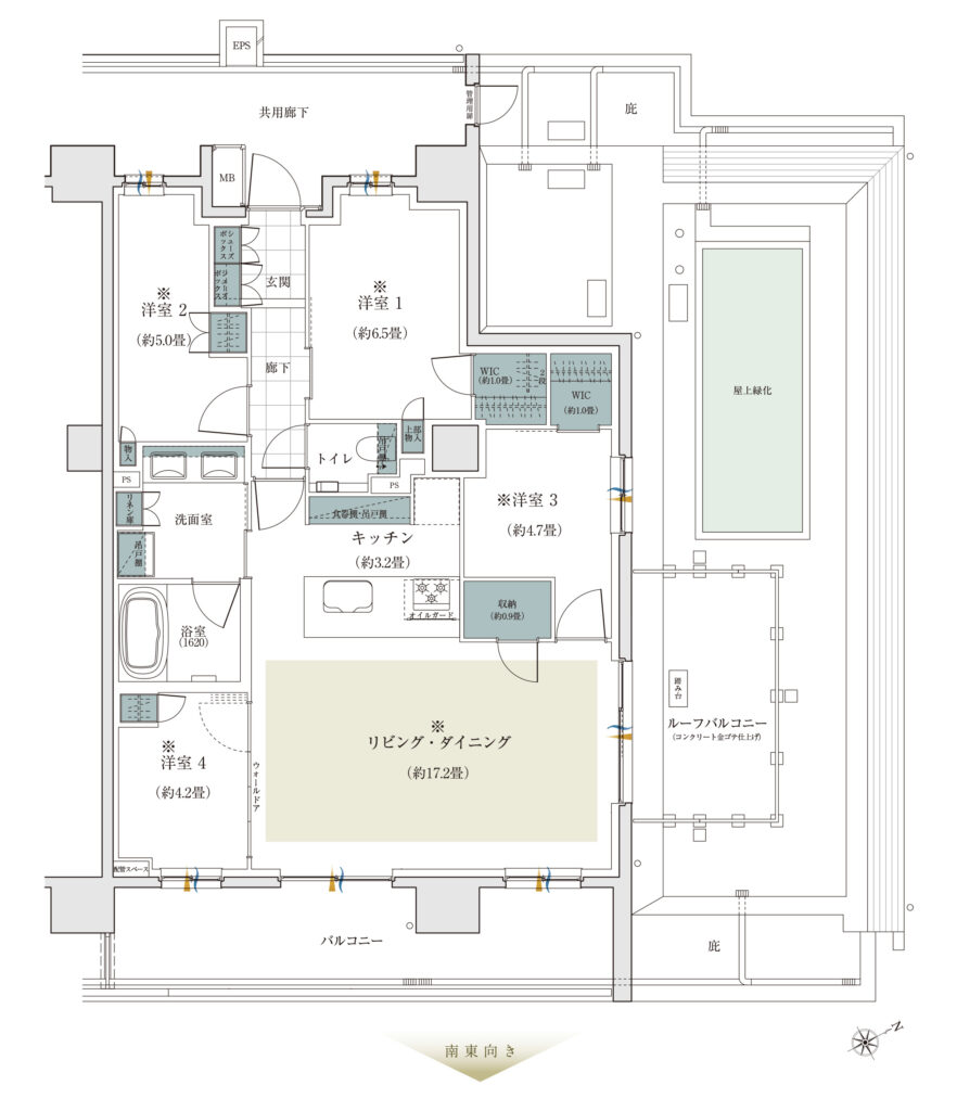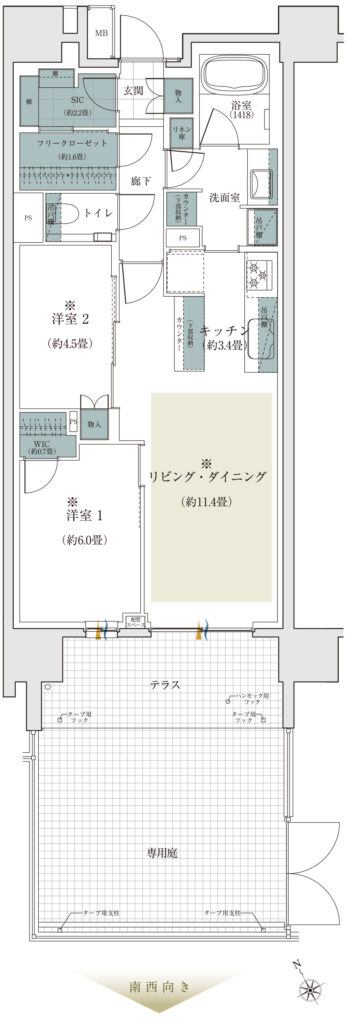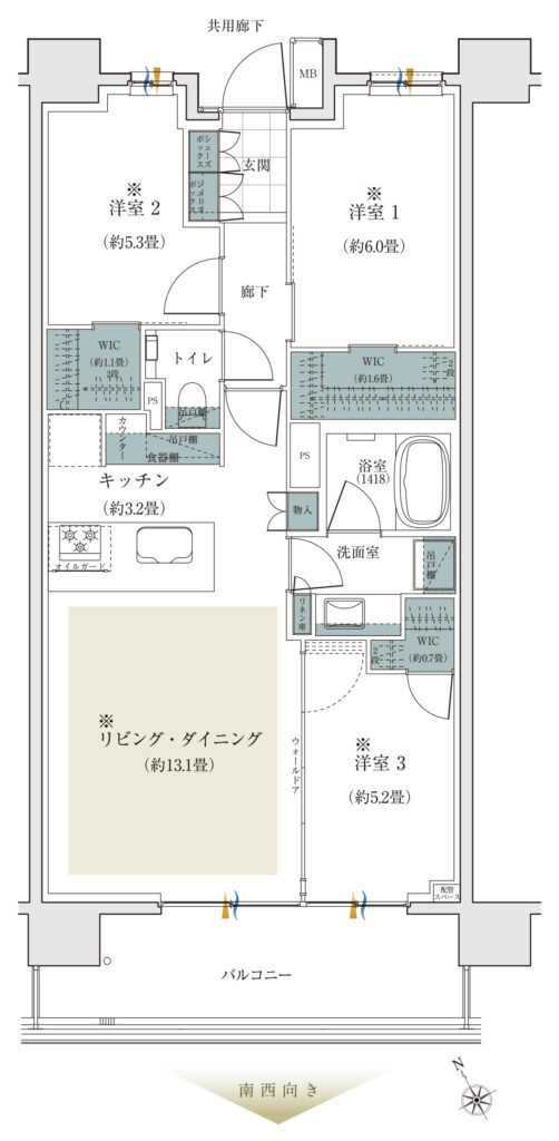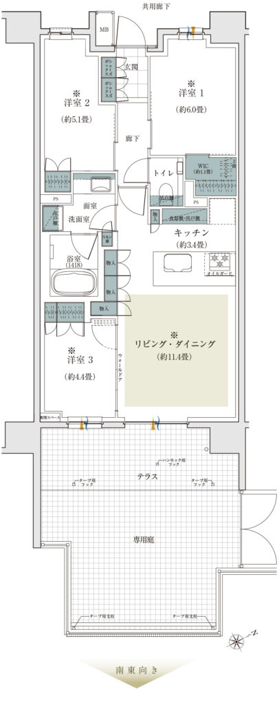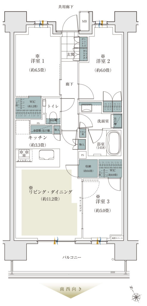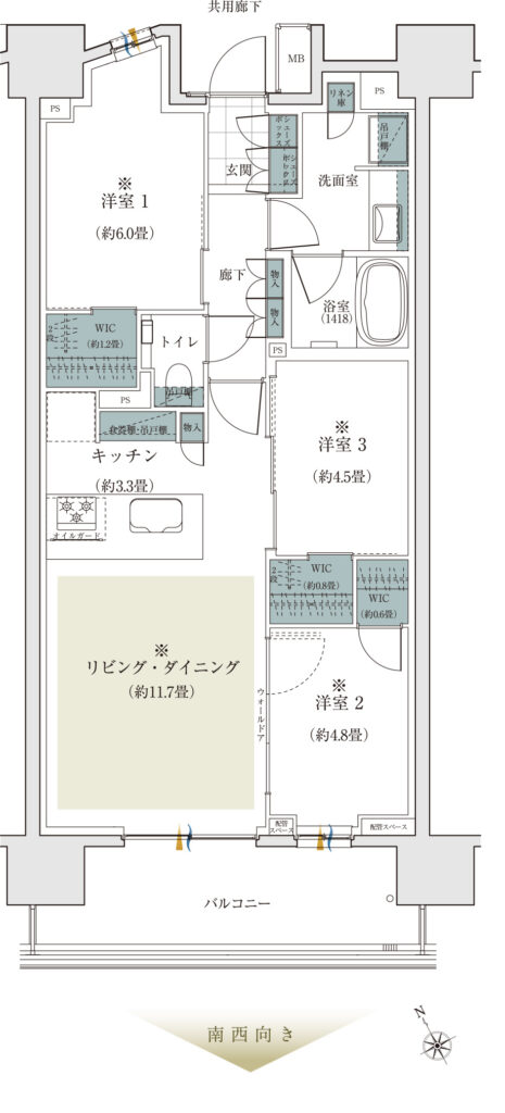 南西向きは70㎡超の広めの部屋が多く、ファミリーが快適に暮らせる当マンションの大きなポイントになってきます。60㎡台でもなく、小規模マンションにありがちなトリッキーでもない、居住性が高い70㎡超の「田の字型」の間取り。