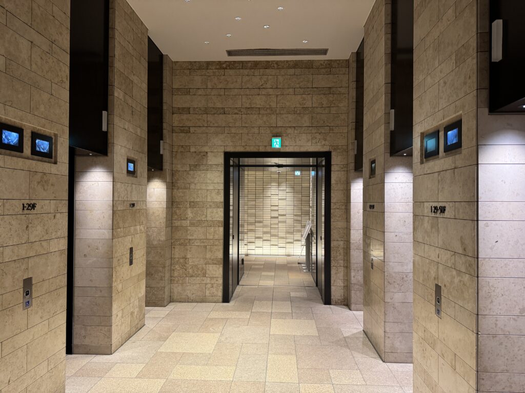 エレベータは低層階用が分速180m、高層階用が同240mで非常に早く、面倒なく移動できます。29階で低層階と高層階のエレベーターに分かれています。