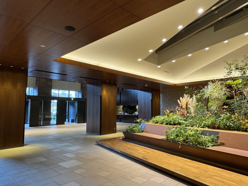 二層吹き抜けのエントランスホールは音楽が流れる上質な空間で、帝国ホテルの正面玄関に着飾るような植栽は常にメンテナンスされています。外廊下ながらフロアによって異なる廊下の装いやエレベーターホールなど、凝った造り。