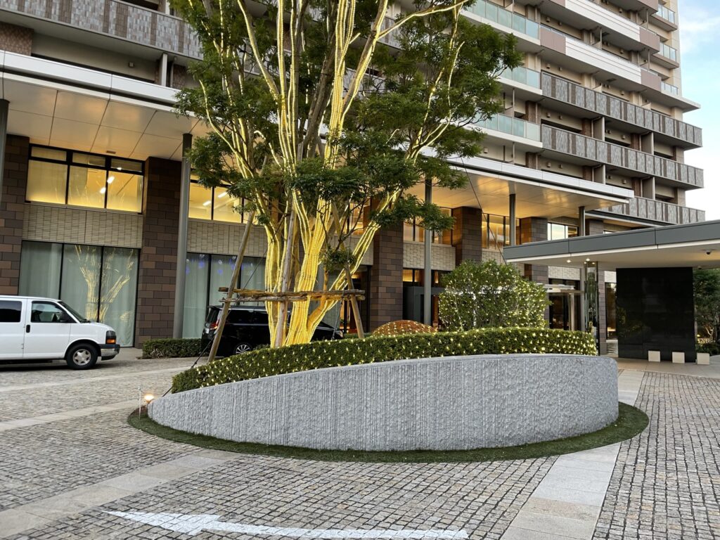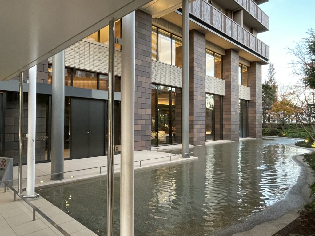 敷地は、公開上の空地と自走式の駐車場が併設されていて広々。水盤に囲まれたエントランスと車寄せが高級タワーの風格を出しています。