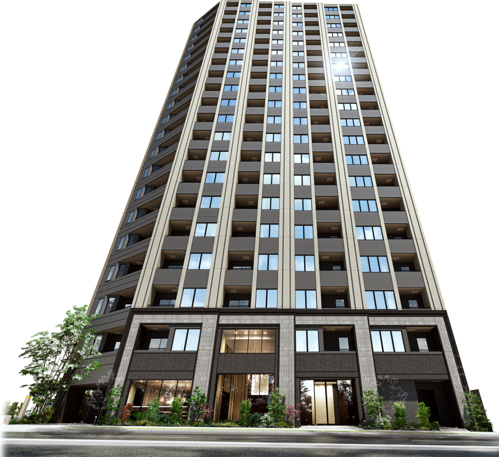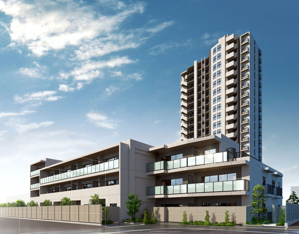 20階建てのタワー棟と低層レジデンス棟で構成される全145戸のプロジェクトで、平均専有面積72㎡超、3LDKを中心としたファミリータイプのマンション。