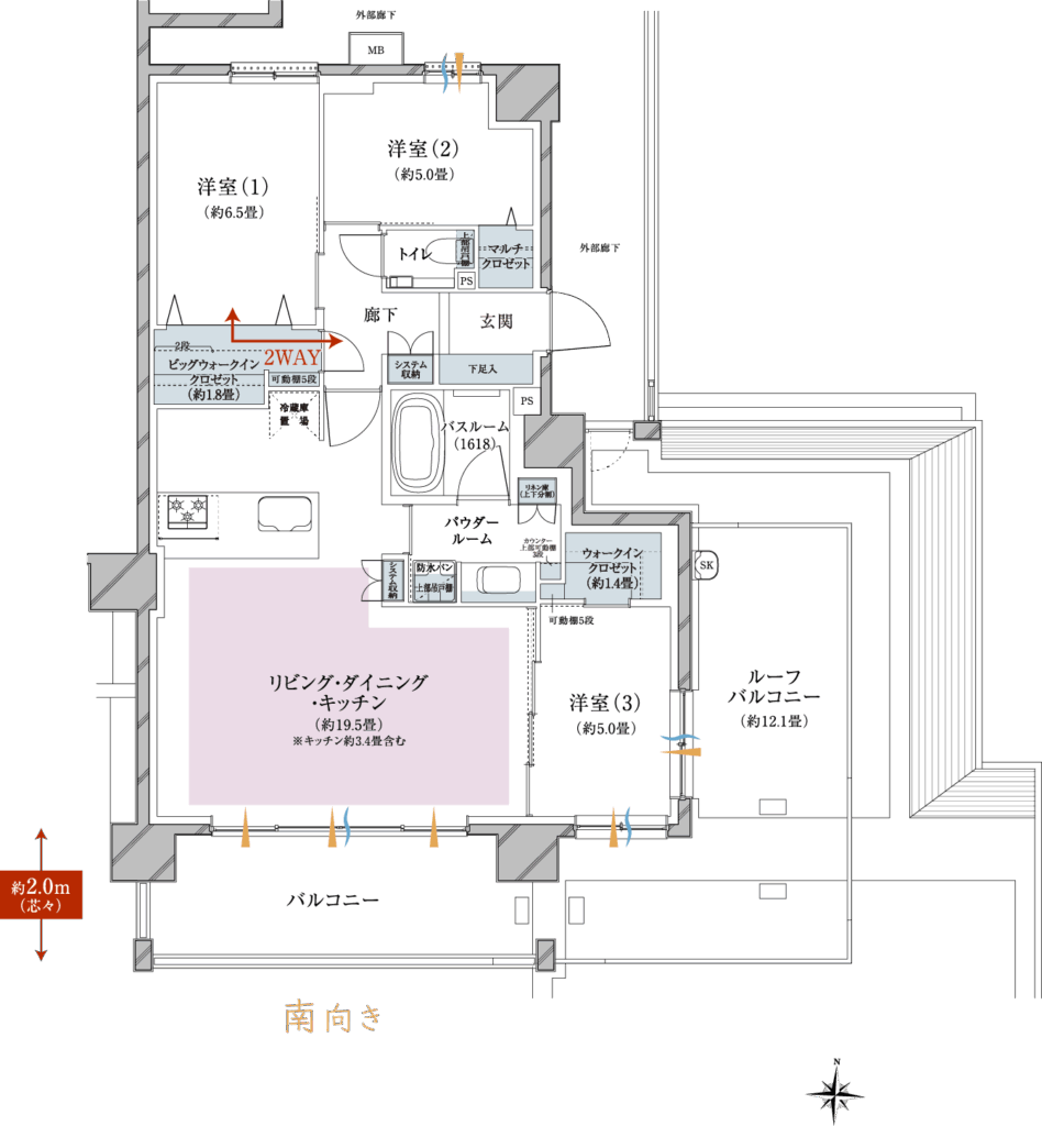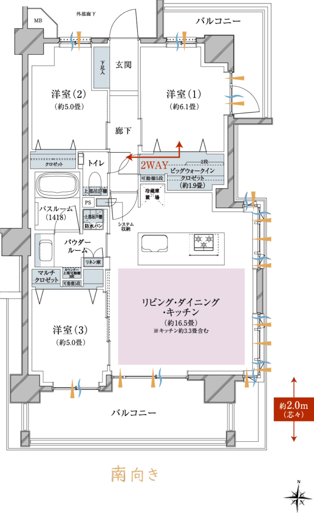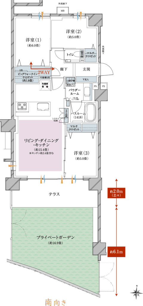 敷地南側は、比較的低層の建物が並んでいて、4階くらいから抜け感がでてきます。さらに高層階は、遠方までの眺望も楽しめそうです。南向きの日当たりと抜け感は最高ですね(一部、前建ての存在がきつい住戸もあります。ギャラリーで要確認)。その恵まれた住環境を引き立てるのがLDと隣洋室に境目を設けない「連窓サッシ」で、室内の採光性、解放感を高めてくれます。また、敷地北側の環境が抜けているため、共用廊下側の居室でも明るさを保てています。全洋室表記でサービスルームがありません。