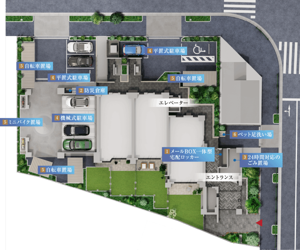 共用施設は、メールボックス一体型宅配ロッカー、24時間対応のゴミ置き場、ペット足洗い場、防災倉庫などが用意されています。宅配ボックスを利用した食材宅配受け取りサービス「食デリ」が便利。東口の「イオン西新井店」(徒歩9分)と連携する予定だそうです。サードプレイス的な空間は特にありません。