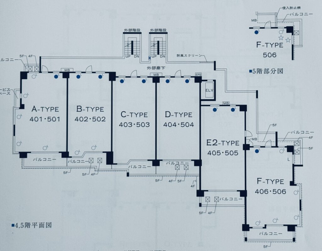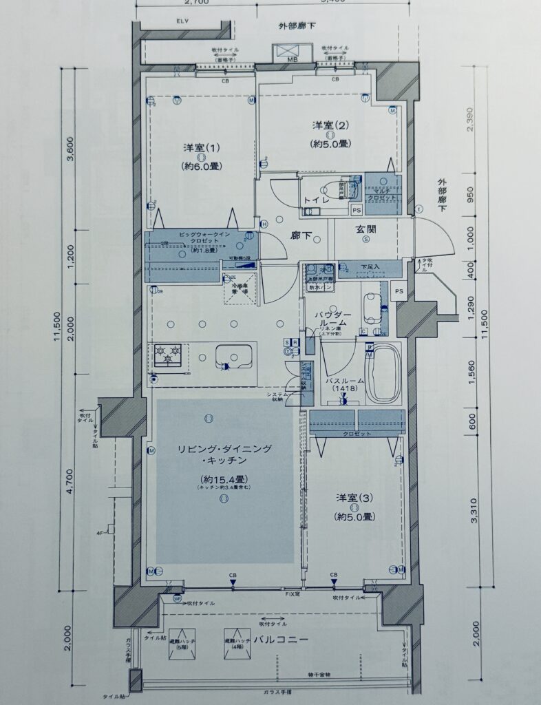 設備面では、LDに床暖房、食器洗い乾燥機、浴室にミストサウナなど最新のものが揃っています。特にキッチン天板、サイドパネルまで天然御影石が採用され、LDK空間全体に高級感を出している点が見どころです。惜しい点は、共用廊下側の部屋の快適性を高める「可動式ルーバー面格子」が非装着なこと。敷地の北側が道路に面しているため、尚更欲しかった印象です。