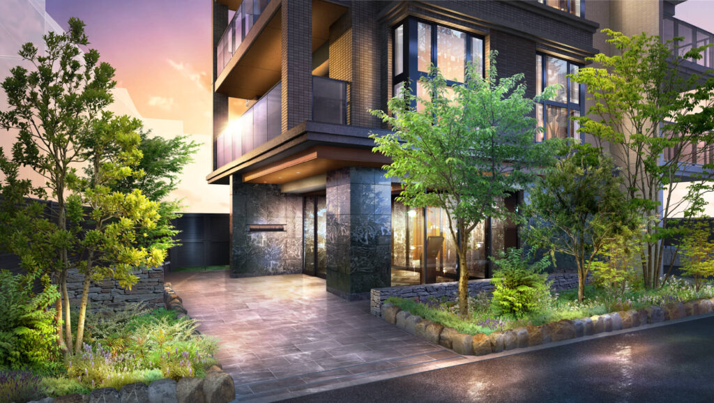 交通量が比較的多い道路沿いですが、エントランス付近は外部の視界から配慮された設計。歩道から奥行きあるアプローチを進み、曲がって風除室に入っていきます。また、奥行感あるアプローチと周囲を飾る植栽が、邸宅感を出す雰囲気があるデザインで竣工後が楽しみです。