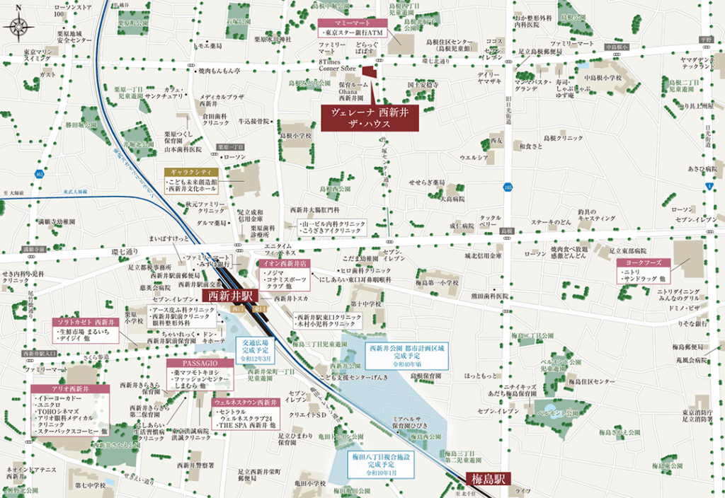 西新井といえば、再開発された駅西側エリアが人気ですが、本物件が建つポイントは、東口でも比較的便利な日常生活を送れるグッドポジション。マンション周辺には、大型スーパーの「マミーマート」「ドラッグストアぱぱす」「ファミリーマート」が集まっています。通学区の「島根小学校」は、大通りを渡らない徒歩6分で通学しやすく、近隣には大小公園も多く暮らしやすい環境を形成しています。子育てファミリーにとって、東口は「ギャラクシティ」(徒歩7分)の存在が大きいですね。